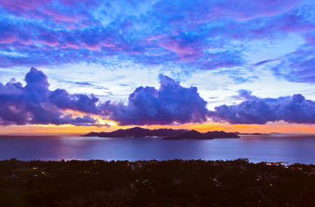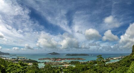 Panorama view of the coast of Seychelles with white beaches and lush green forests under cloudy sky