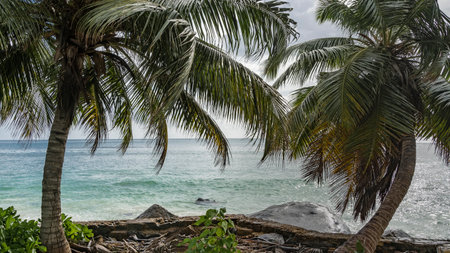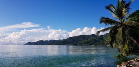 Beautiful palm trees on the ocean. Sprawling green leaves and curved trunks against a background of blue sky, clouds, turquoise water. Seychelles. Mahe