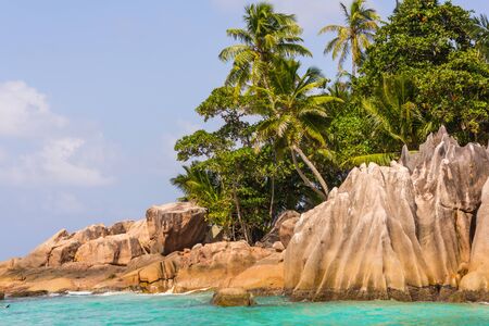 Coastline of La Digue island in Seychelles. Rocks of Grand and Petite Anse paradise beaches with blue ocean lagoon between green foliage of jungle.