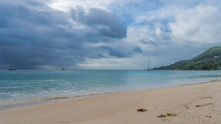 Rain clouds hung over the ocean. Several yachts on turquoise water. A green hill against the sky. Sandy beach in the foreground. Seychelles. Mahe. Beau Vallon