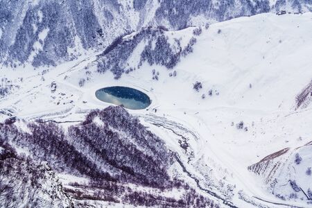 Snow-capped mountain peaks and deep gorges in the area of cross pass, Georgia. Fog, clouds, snow. Round lake in the gorge
