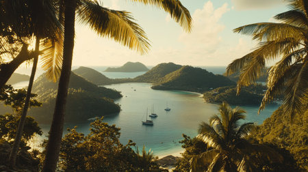 Experience the tranquil beauty of a tropical bay showcasing sailboats gently resting in clear waters, framed by lush palm trees under a stunning sunset.