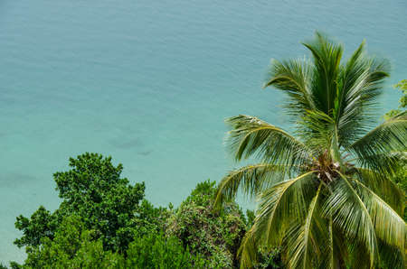 Daytrip to Therese Island. Mahe, Seychelles Coconut palm trees on tropical secluded sandy beach, blue lagoon against a blue sky