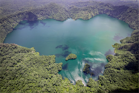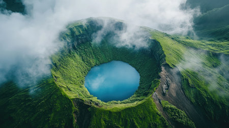 This stunning aerial image captures a tranquil crater lake nestled in lush greenery and surrounded by ethereal clouds, showcasing nature's beauty.