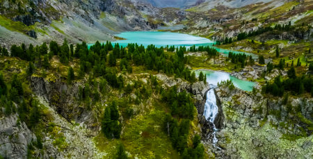 Blue lake in valley. Turquoise river in rocks. Hiking in mountains in Altai nature