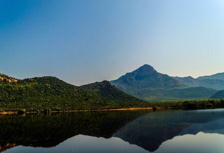 hill and water lake with clear summer sky. Beautiful summer landscape in the mountains of Siberia.