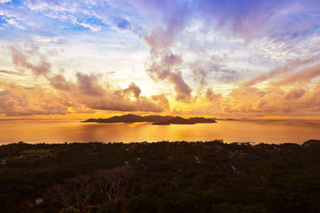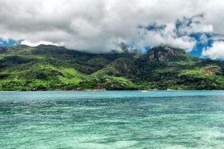 Panorama view of the coast of Seychelles with white beaches and lush green forests under cloudy sky
