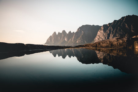 Dark atmospheric landscape with orange tent near mountain lake in highland valley under cloudy sky in dark time. Ripples on mountain lake water in dusk. Dark scenery with water ripple on highland lake