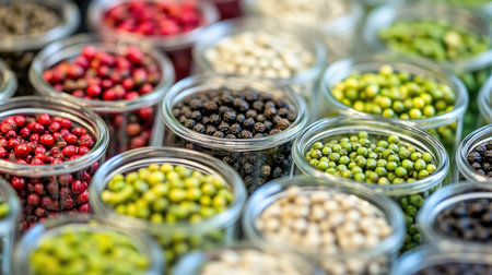 An artistic arrangement of colorful peppercorns black, white, and green in a variety of small glass jars, showcasing the diversity of this essential seasoning