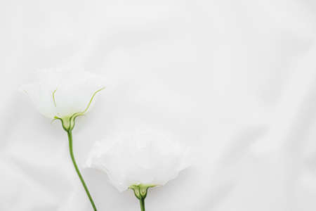 White rose flowers on silk fabric as bridal flatlay background, wedding invitation and holiday branding, flat lay design