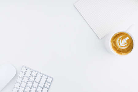 Conceptual office table or office desk. There are white computer keyboard, white mouse, clean grid notes and tulip shaped latte art coffee in coffee cup with clean background and copy space. Top view