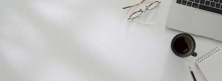 Overhead shot of minimal workspace with laptop, coffee mug, supplies and copy space on white home office desk
