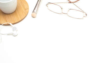 On a white office table, gold-framed glasses, a white cup on a wooden stand, headphones and a makeup brush. Women's business. Copy space