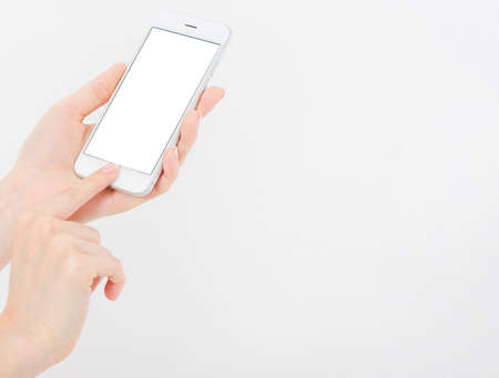 female hand hold mobile phone isolated on white, woman holding phone with empty display,blank screen,touching
