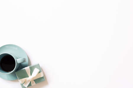 Green gift box and cup of coffee on white background. top view, copy space