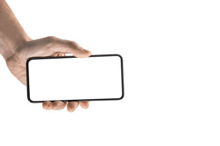 Mockup image, Man hand holding black smartphone isolated on white background. Person holding cell phone with blank white screen. Mobile app mock up. holding smartphone with empty screen, front view