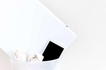 Laptops and smartphones thrown in the trash. Image of digital detox