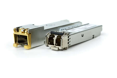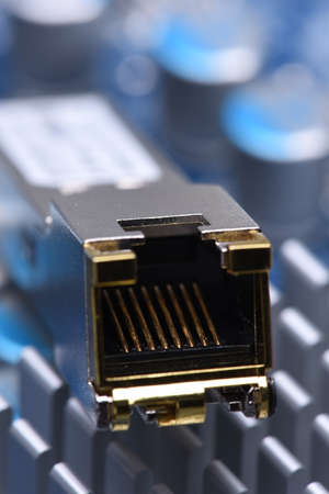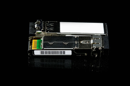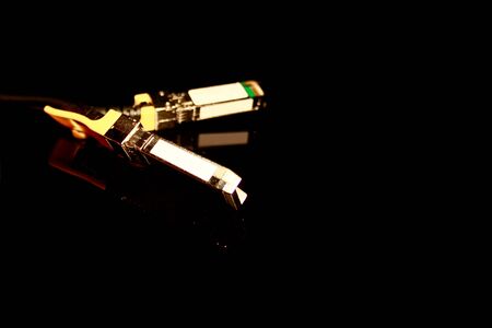 Electrical Internet SFP network modules, network switch, RJ45 ethernet cable, RJ45 connectors, circuit board with microchips, diodes are on the black background