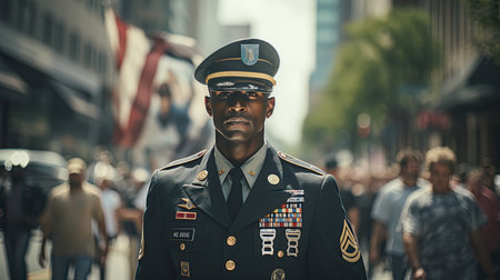 A dramatic image of United States military heroes silhouetted before the nation's flag, celebrating Veterans Day, Memorial Day. Generative AI