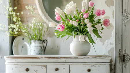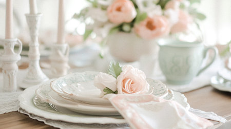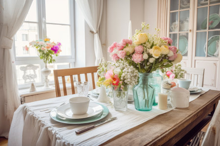 a shabby chic dining table with place settings and a vase of fresh flowers, created with generative ai
