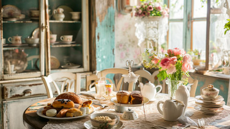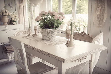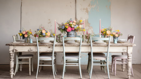 shabby chic dining room with a vintage table, chairs and floral centerpiece, created with generative ai