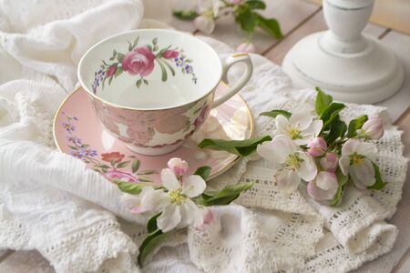 pink vintage afternoon tea party, tea cup and tender flowers on wooden tray and lacy tablecloth