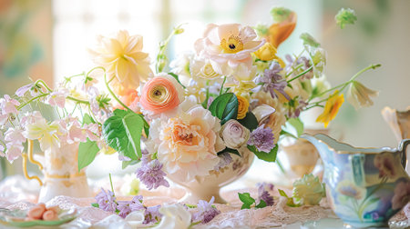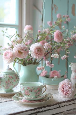 Vintage floral tea room with elegant pink rose decor and classic china set. That the image is generated using AI.