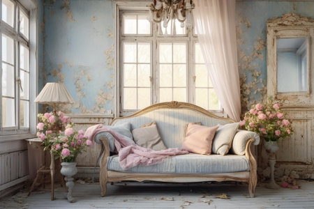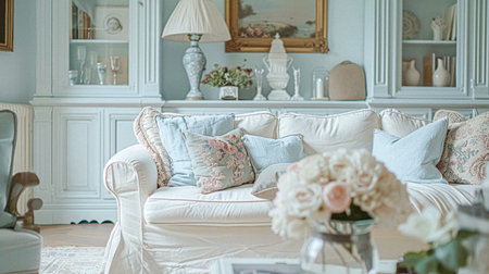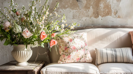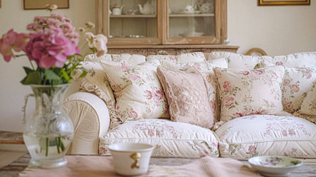 Cozy, sunlit vintage living room with floral decorations and a classic sofa