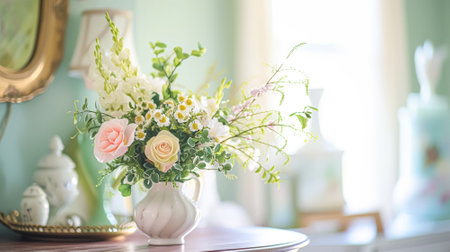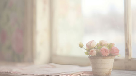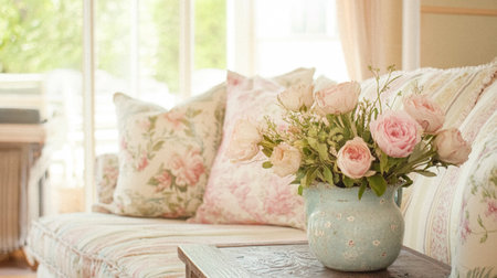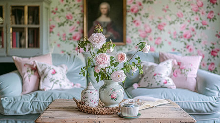 A serene living room scene featuring a rustic coffee table adorned with a delicate floral arrangement of roses. Soft pastel colors enhance the cozy atmosphere, creating an inviting space for relaxation.