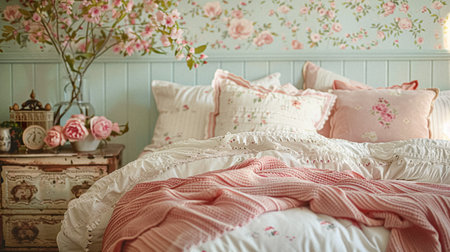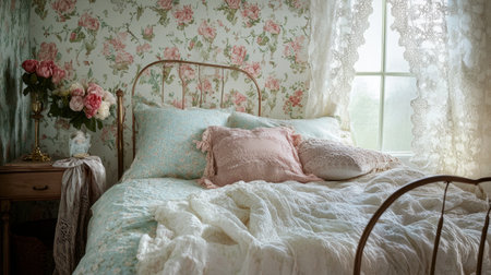 Discover a charming vintage bedroom featuring floral wallpaper and soft bedding. This inviting space radiates warmth and tranquility, perfect for relaxation.
