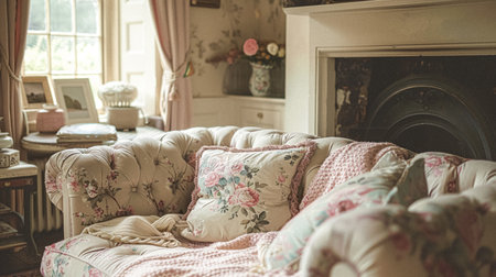 Cozy sunlit vintage living room with floral decor and comfortable seating. That the image is generated using AI.