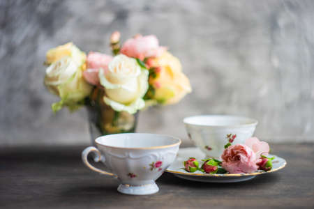 Vintage porcelain tea cups with pink roses on the windowsill