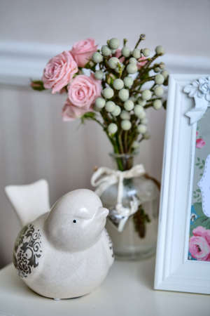 Close-up in the interior decor. Ceramic bird, photo frame and vase with flowers