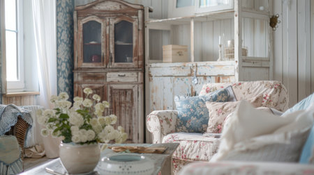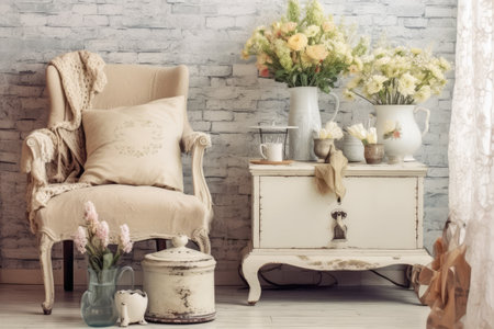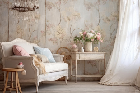shabby chic living room with cozy armchairs, side tables, and chic designs, created with generative ai