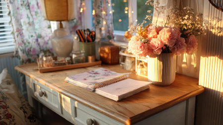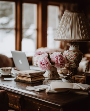A beautifully styled workspace featuring a wooden desk adorned with a floral arrangement, inviting natural light, and a cozy ambiance perfect for creative pursuits.