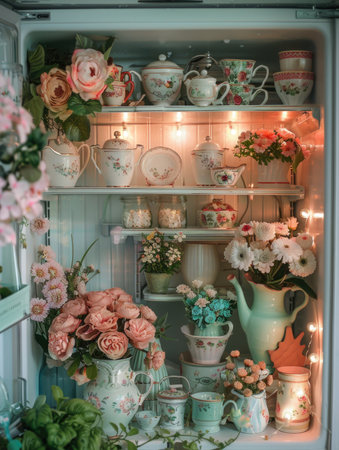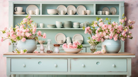 Teacups and floral decor on kitchen shelves: vintage decor, floral kitchen, cozy lifestyle, home aesthetics, interior styling, charming organization.