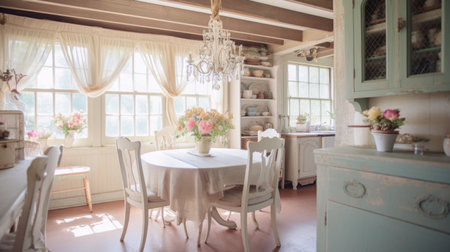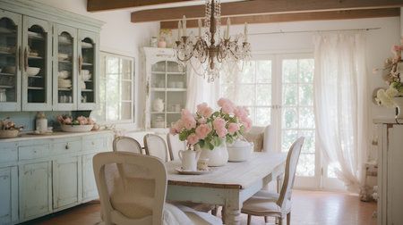 Interior design inspiration of Farmhouse Shabby Chic style home dining room loveliness decorated with Wood and Lace material and Chandelier .Generative AI home interior design .
