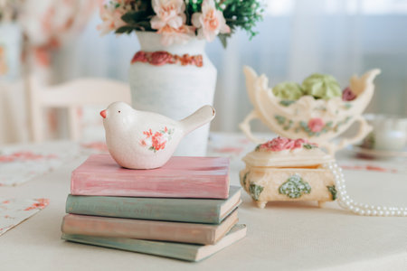 Charming scene with a ceramic bird on stacked pastel books, floral accents, and a vintage vase. The composition exudes a cozy, elegant, and peaceful atmosphere, perfect for a rustic setting