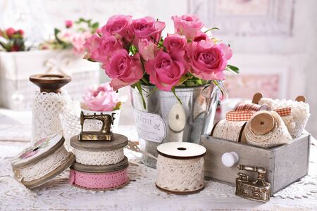 vintage style still life with cotton lace trims on wooden spools and bunch of pink roses on the table