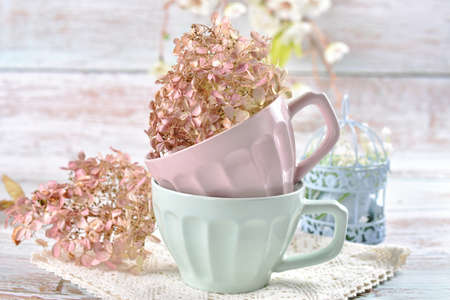 romantic still life with pastel color mugs filled with dried hydrangea flowers on the table