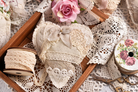 Flat lay of vintage style handicraft heart made of linen and laces in wooden box with sewing supplies