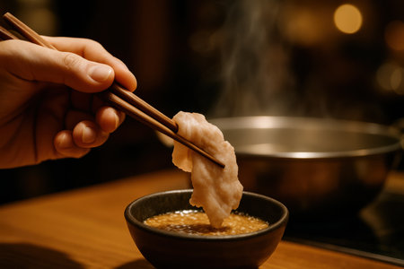 Hand using wooden chopsticks to dip a thin slice of raw meat into a small bowl of savory sauce. steaming hot pot is visible in the blurred background, highlighting a traditional shabu shabu or sukiyaki dining experience.