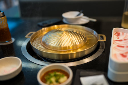 Empty metallic brass BBQ pan set on electricity stove. Thai buffet food with pork and meats, cooked on the brass barbecue pan. Hot pot Korean in Japan Yakiniku BBQ barbecue style.