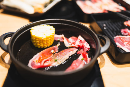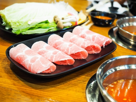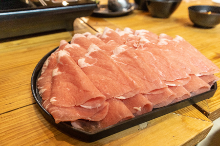sliced pork in a dish on table for hot pot in a restaurant