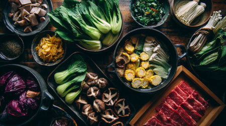 A captivating display of fresh organic ingredients for a hot pot dinner featuring a colorful assortment of vegetables and premium meat on a rustic wooden table.