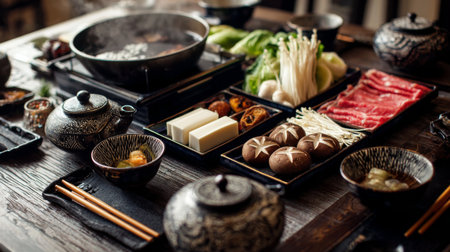 Wide shot of a table set for shabu-shabu, with a hot pot in the center surrounded by plates of fresh ingredients like mushrooms, greens, and dipping sauces.