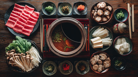 A captivating top-down view of a Japanese shabu shabu hotpot, featuring an array of fresh vegetables, mushrooms, and meats arranged beautifully for a communal dining experience.