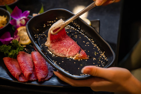 Hand picks a premium rare slices of Kagoshima Wagyu A5 beef with marbled texture and season with chopped scallion and sesame with tongs from a black plate. Served for Yakiniku and Shabu.