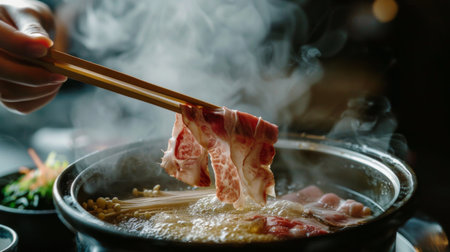 Chopsticks held by a hand, taking a slice of beef into a simmering shabu pot, creating a delicious meal experience.
