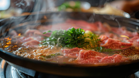 Enjoy a vibrant scene of a sizzling Japanese hotpot filled with thinly sliced meat and fresh vegetables, creating a warm and inviting dining experience.